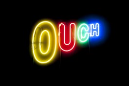 A neon sign depicting the English phonetic sound of pain - Ouch. Its colorful, neon-lit pop aesthetic is attractive and nostalgic on the surface, but upon giving the work a closer look when reading its title, one can see there is a much more tragic and grim story at play here. The lighthearted beauty of the piece lures the viewer into the opposite expression of real sharp-edged agony, burning brightly like a shout in the darkness or an openly exposed wound.