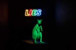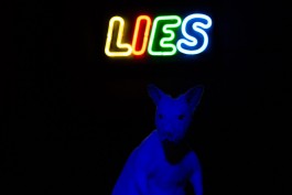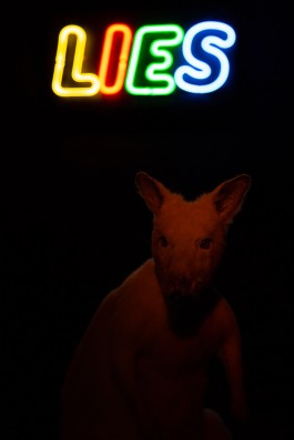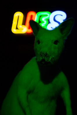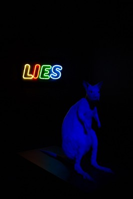 Inside an inaccessible pitch dark vitrine, an albino kangaroo stands alone with a neon sign that reads the word “Lies” behind it. Disco lights flicker as the animal changes color like a chameleon, making it difficult to grasp its form fully. In this work, the kangaroo impersonates the global citizen of today, trapped within his own constructed bubble of lies and deception. Living in denial of the political and social situations surrounding him, this silly character nonchalantly shape shifts and maneuvers his psyche and physique to fit his skewed view of the world, even though he is totally aware of its artificiality.